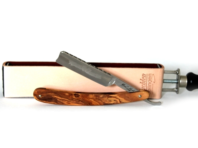Rasiermesser Set-Angebot, zweiteilig: Ralf Aust Solingen Rasiermesser mit Klingenätzung SOLINGER HANDARBEIT, vollem Hohlschliff, Klinge aus rostfreiem Edelstahl, Heft aus Olivenholz. Inklusive doppelseitigem Streichriemen aus Juchtenleder. Eine Seite des Streichriemens ist bereits mit grüner Streichriemenpaste vorgepastet.