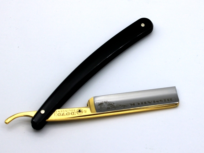 Solinger Rasiermesser mit 5/8 Zoll breiter Klinge aus traditionellem Karbonstahl (sehr schnitthaltig, nicht rostfrei), Gradkopf-Klinge mit vollem Hohlschliff. Vergoldeter Erl und Rücken. Die Klinge ist mit einer matten BISMARCK Ätzung verziert. Die Griffschalen sind aus schwarzem Kunststoff gefertigt.