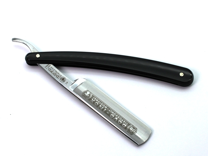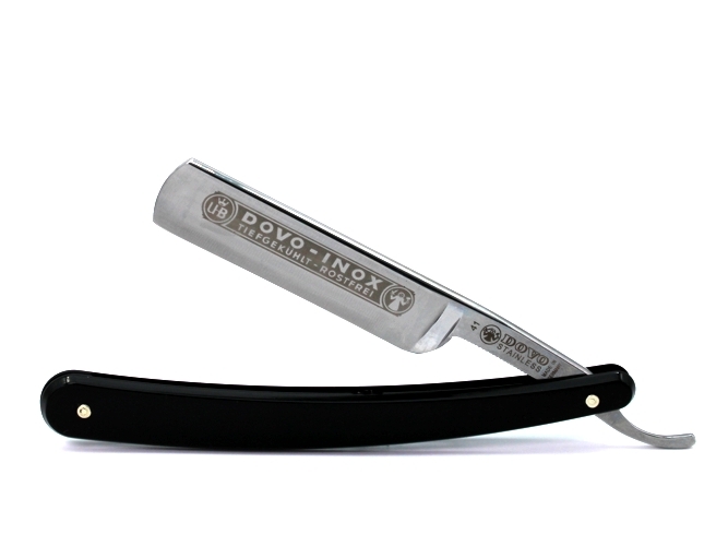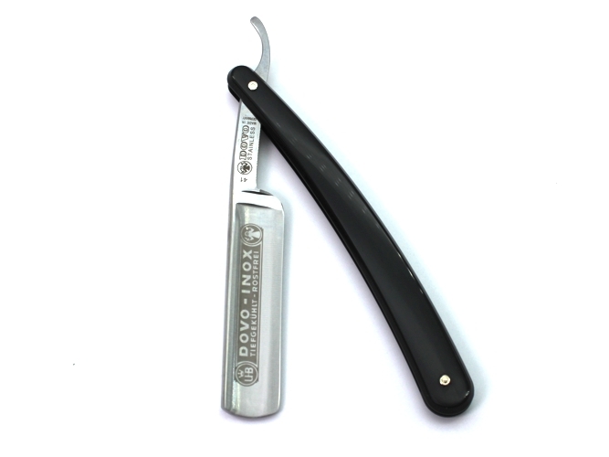 Solinger Rasiermesser mit 5/8 Zoll breiter Klinge aus rostfreiem Edelstahl, voller Hohlschliff, Klinge mit Ätzung DOVO INOX, Heftschalen aus schwarzem Kunststoff.