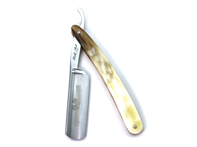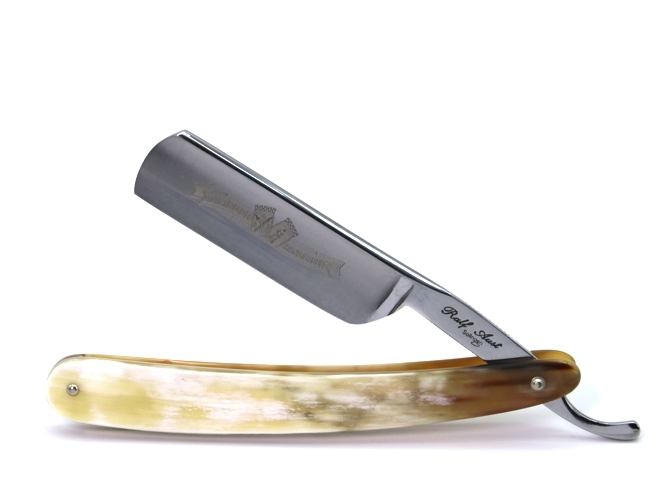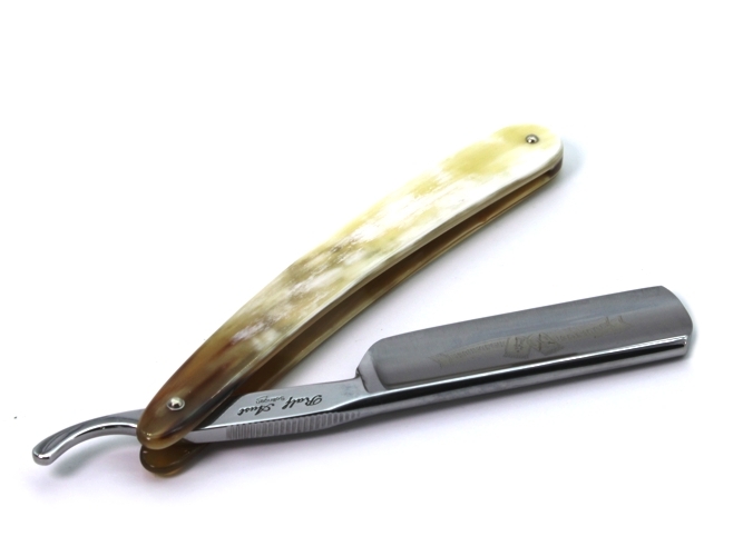 Rasiermesser von Ralf Aust Solingen mit 6/8 Zoll breiter Klinge aus traditionellem Karbonstahl (sehr schnitthaltig, nicht rostfrei), klassischem Rundkopf, Hohlschliff, mit serriertem Erl und Heft aus poliertem Horn. Horn ist ein natürliches Material und kann in Farbe und Struktur Abweichungen aufweisen. Die Klinge verfügt über eine Ätzung SOLINGER HANDARBEIT. Die Rasiermesser-Manufaktur Ralf Aust ist noch eines jener Solinger Unternehmen, die in alter, traditioneller Handarbeit Rasiermesser von überragender Qualität herstellen.