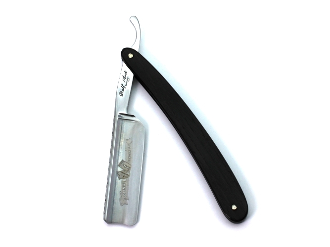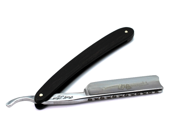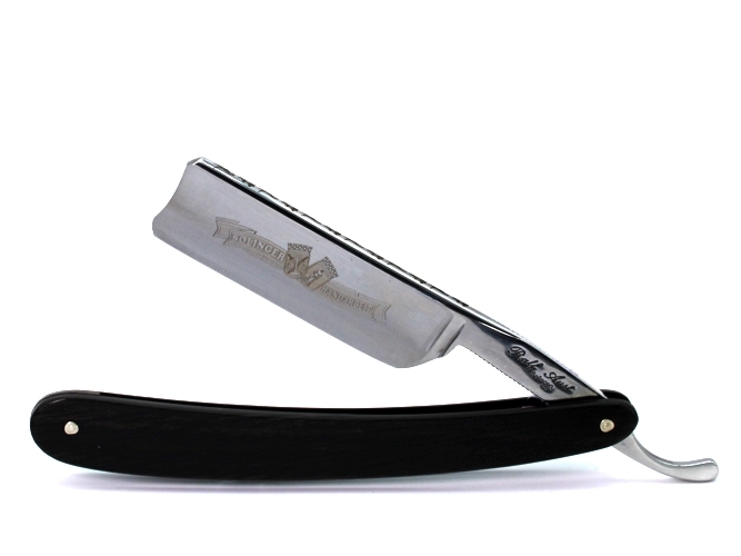 Rasiermesser von Ralf Aust Solingen mit 6/8 Zoll breiter Klinge aus traditionellem Karbonstahl (sehr schnitthaltig, nicht rostfrei), spanischer Kopfform und vollem Hohlschliff, mit serriertem Erl und Heft aus Räuchereiche. Die Klinge ist mit einer Ätzung SOLINGER HANDARBEIT und einer Rückengravur verziert. Die Rasiermesser-Manufaktur Ralf Aust ist noch eines jener Solinger Unternehmen, die in alter, traditioneller Handarbeit Rasiermesser von überragender Qualität herstellen.