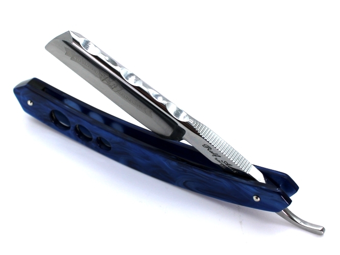 Rasiermesser von Ralf Aust Solingen mit 7/8 Zoll breiter Klinge aus traditionellem Karbonstahl (sehr schnitthaltig, nicht rostfrei), Klinge mit französischer Kopfform und Kullenrücken - Zierschliff, Hohlschliff, mit serriertem Erl und Heftschalen aus blauem Acryl Edelharz. Die Klinge verfügt über eine Ätzung SOLINGEN HANDARBEIT. Die Rasiermesser-Manufaktur Ralf Aust ist noch eines jener Solinger Unternehmen, die in alter, traditioneller Handarbeit Rasiermesser von überragender Qualität herstellen.