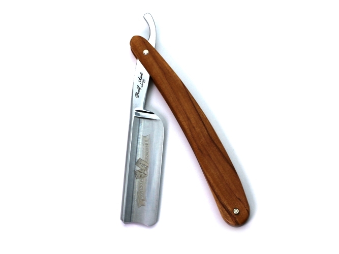 Rasiermesser von Ralf Aust Solingen mit 7/8 Zoll breiter Klinge aus traditionellem Karbonstahl (sehr schnitthaltig, nicht rostfrei), spanischer Kopf, voller Hohlschliff, Klingenätzung SOLINGER HANDARBEIT, mit serriertem Erl und Heft aus Olivenholz. Die Rasiermesser-Manufaktur Ralf Aust ist noch eines jener Solinger Unternehmen, die in alter, traditioneller Handarbeit Rasiermesser von überragender Qualität herstellen.