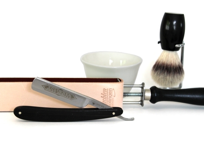 Rasiermesser Set Angebot 5-teilig für Einsteiger und Fortgeschrittene: Solinger DOVO Rasiermesser mit 5/8 Zoll breiter Rundkopfklinge aus Karbonstahl (sehr schnitthaltig, nicht rostfrei), voller Hohlschliff, Klinge mit SOLINGEN BEST QUALITY Ätzung, Heftschalen aus dunklem Ebenholz gefertigt, DOVO Rasierpinsel mit Besatz aus synthetischem Kunsthaar. Mit Ständer für den Rasierpinsel, handgefertigte Seifenschale aus Porzellan (asymmetrische Form) und doppelseitigem Streichriemen aus Juchtenleder. Eine Seite des Streichriemens ist bereits mit Streichriemenpaste vorgepastet.