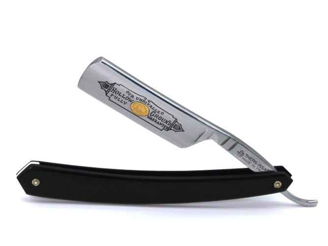 Thiers-Issard Rasiermesser 6/8 Zoll Klinge aus Karbonstahl C135 (sehr schnitthaltig, nicht rostfrei), voller Hohlschliff, mit BISON Goldätzung, Heftschalen bestehen aus Ebenholz. Die Lieferung erfolgt inklusive Stecketui aus Leder. Alle Thiers Issard Rasiermesser werden nach alter Tradition in Handarbeit hergestellt.