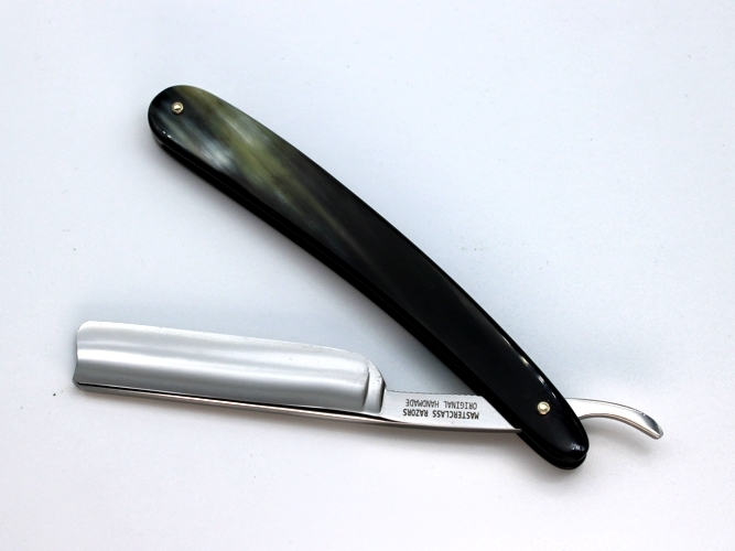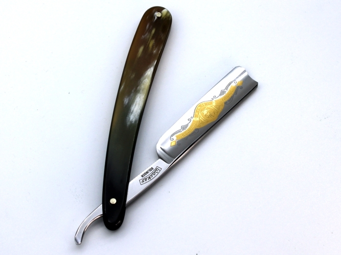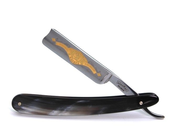 Solinger Rasiermesser der Firma WACKER mit 5/8 Zoll breiter Klinge mit spanischem Kopf aus nicht rostfreiem, jedoch sehr schnitthaltigem Karbonstahl, voller Hohlschliff (1/1) mit Klingenätzung "Original Wacker Solingen". Die Heftschalen sind aus poliertem Horn gefertigt. Horn ist ein Naturprodukt und unterliegt natürlichen Farbschwankungen und Strukturen. Dadurch wird jedes Heft einzigartig.