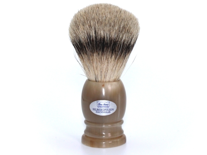 exklusiver Hans Baier Rasierpinsel mit Besatz aus Dachshaar (Silberspitz) und Griff aus eher hellem Horn. Horn ist ein natürliches Material, das Abweichungen in Farbe und Struktur aufweisen kann.