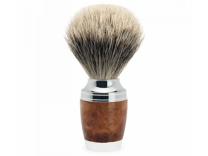Mühle Rasierpinsel STYLO mit Besatz aus feinem Dachshaar Der Griff wurde aus Thuja, einem Edelholz und verchromtem Metall gefertigt. Ringgrösse: ca. 21mm.