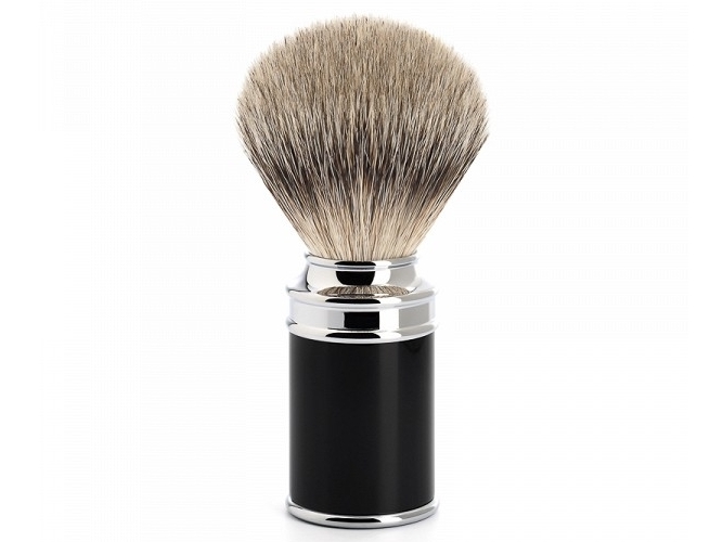 Mühle Rasierpinsel Traditional mit Besatz aus Silberspitz Dachshaar und Fuß aus verchromtem Metall mit schwarzem Edelkunstharz.