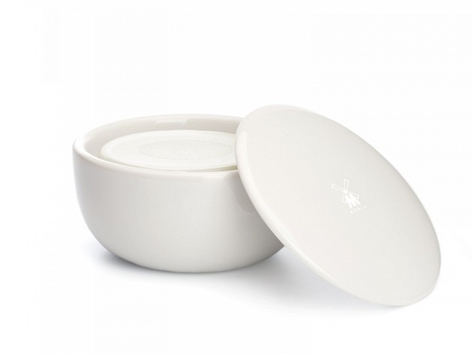 Mühle Rasierseife Sanddorn in weißer Porzellanschale mit Deckel.
