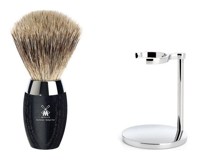 Produktbeschreibung: Rasierpinsel Set Angebot Mühle KOSMO feines Dachshaar Mooreiche