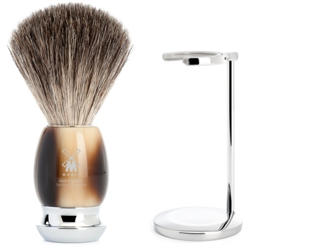 Das zweiteilige Set Angebot besteht aus einem Mühle Rasierpinsel mit Dachshaar - Besatz aus der VIVO Design Serie und einem soliden Halter aus verchromtem Metall. Der Fuß des Rasierpinsels ist aus hornfarbenem Edelkunstharz und verchromtem Metall gefertigt und hat eine Ringgröße von 21mm. In dem mitgelieferten Halter kann der Dachshaarrasierpinsel nach der Anwendung und Reinigung gründlich trocknen.